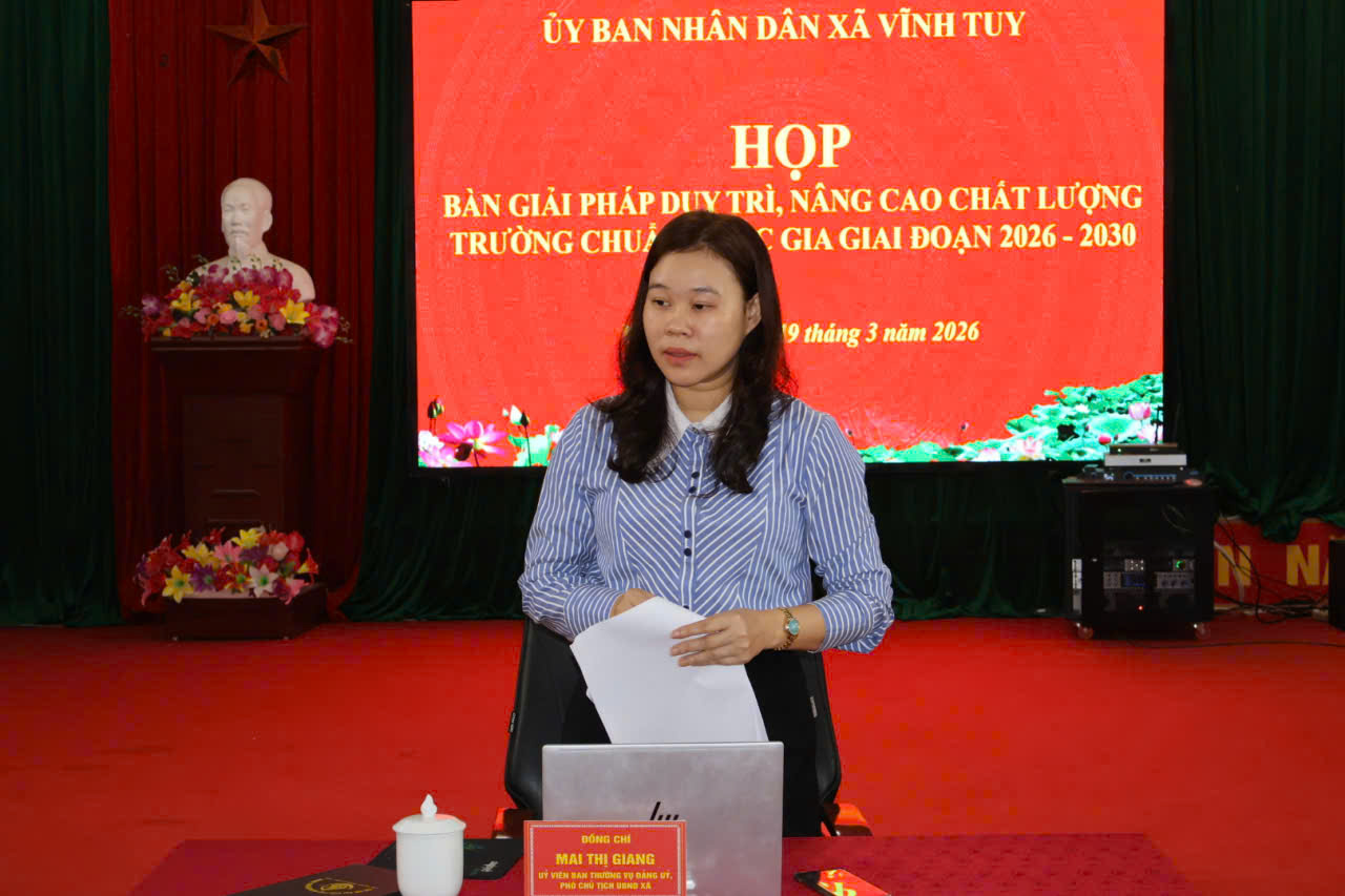 Thực hiện Chương trình công tác tháng 3 năm 2026, ngày 19/3/2026, UBND xã Vĩnh Tuy tổ chức hội nghị rà soát, triển khai các giải pháp xây dựng, duy trì và giữ vững các trường đạt chuẩn quốc gia giai đoạn 2026 - 2031. Đồng chí Mai Thị Giang, Phó Chủ tịch UBND xã chủ trì hội nghị. Dự hội nghị có lãnh đạo, chuyên viên Phòng Văn hóa - Xã hội phụ trách lĩnh vực; Hiệu trưởng các đơn vị trường học; lãnh đạo Văn phòng HĐND và UBND xã.